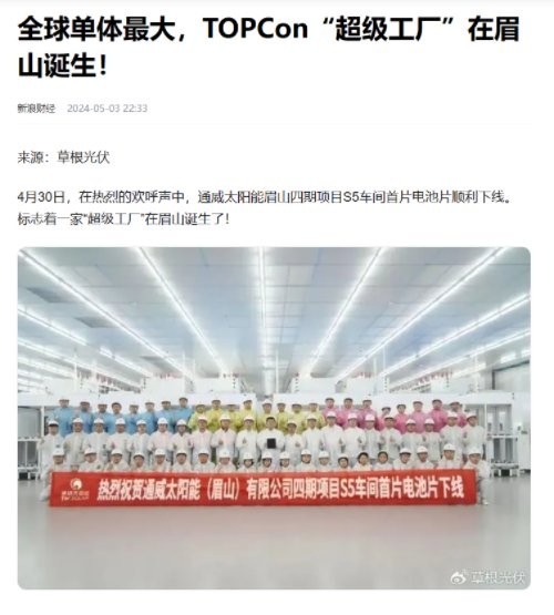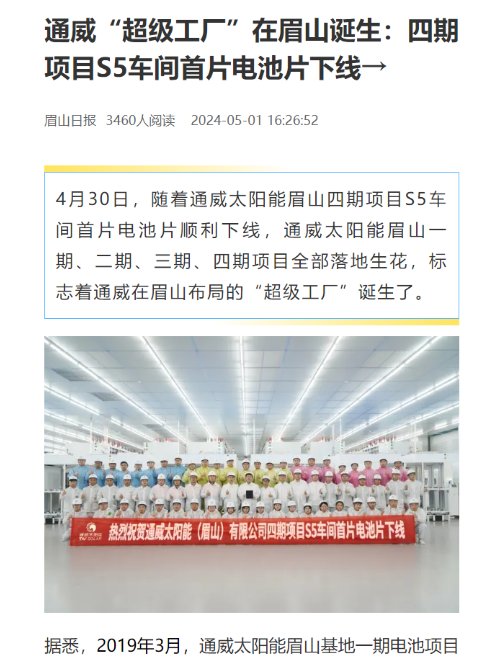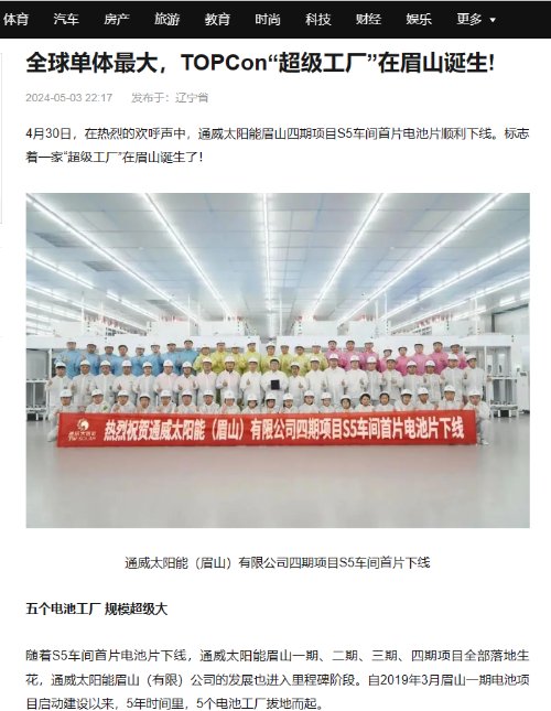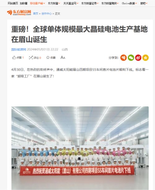 近日,新浪財(cái)經(jīng)、搜狐網(wǎng)、東方財(cái)富網(wǎng)、眉山日?qǐng)?bào)等多家主流媒體先后對(duì)通威太陽能眉山四期項(xiàng)目S5車間首片電池片順利下線進(jìn)行報(bào)道,聚焦通威TOPCon“超級(jí)工廠”在眉山誕生!